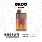 GROO Max Blood Orange Mango offers up to 10000 puffs with a durable, lightweight stainless steel design. Its large battery ensures a comfortable and long-lasting vaping experience.